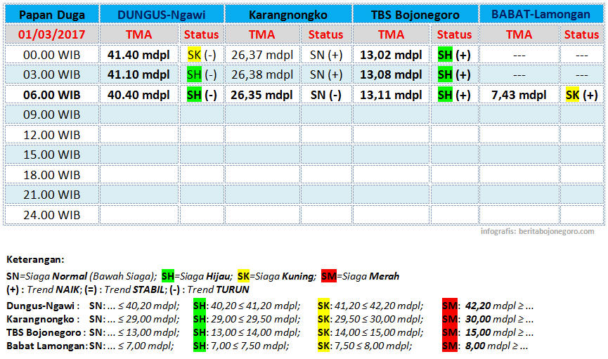 Berikut ini update status TMA Bengawan Solo, yang diterima beritabojonegoro.com dari UPT Pengelola Sumber Daya Air (UPT PSDA) Wilayah Sungai Bengawan Solo untuk tanggal 01 Maret 2017, hingga pukul 06.00 WIB. (*/inc)