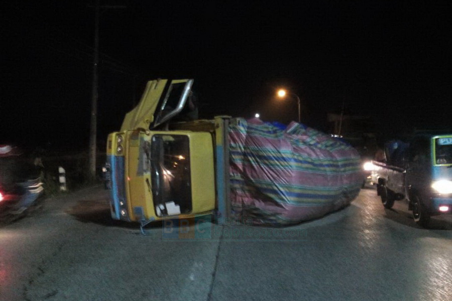 Akibat Roda Belakang Terlepas, Truk Penuh Muatan Terguling di Jalan Raya Kalitidu
