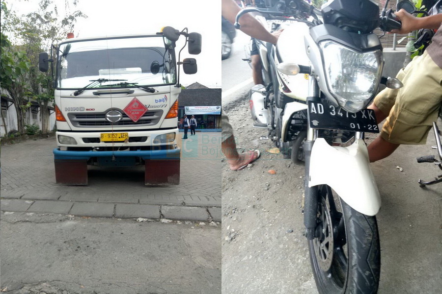 Bersamaan dengan itu dari arah berlawanan atau dari arah barat ke timur, melaju truk yang tidak diketahui identitasnya, kemudian sepeda motor tersebut terserempet di setir kanan dan sepeda motor tersebut jatuh ke arah selatan marka, tepat dibawah kolong truk yang hendak didahuluinya.