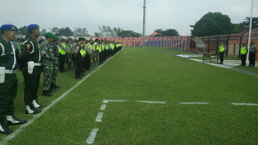 Petugas Kepolisian dari Polres Bojonegoro, TNI serta petugas keamanan terkait sudah tampak siap melaksanakan pengamanan laga antara Persibo melawan Bumi Wali FC .