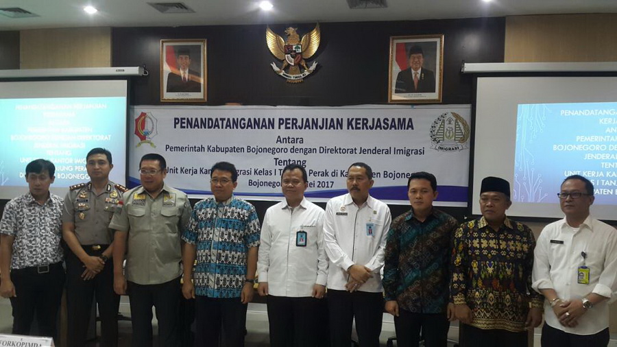 Bojonegoro Kota - Pemerintah Kabupaten (Pemkab) Bojonegoro dan Dirjen Imigrasi, Kementrian Hukum dan Hak Asasi Manusia Republik Indonesia, pada Rabu (17/05/2017) pukul 08.00 WIB pagi tadi, bertempat di ruangan Creative Room gedung Pemkab Bojonegoro lantai 6, lakukan Penanda-tanganan Perjanjian Kerjasama untuk Pembentukan Unit Kerja Kantor Imigrasi di Bojonegoro. Unit kerja tersebut akan menginduk pada Kantor Imigrasi Kelas I Tanjung Perak di Surabaya.
