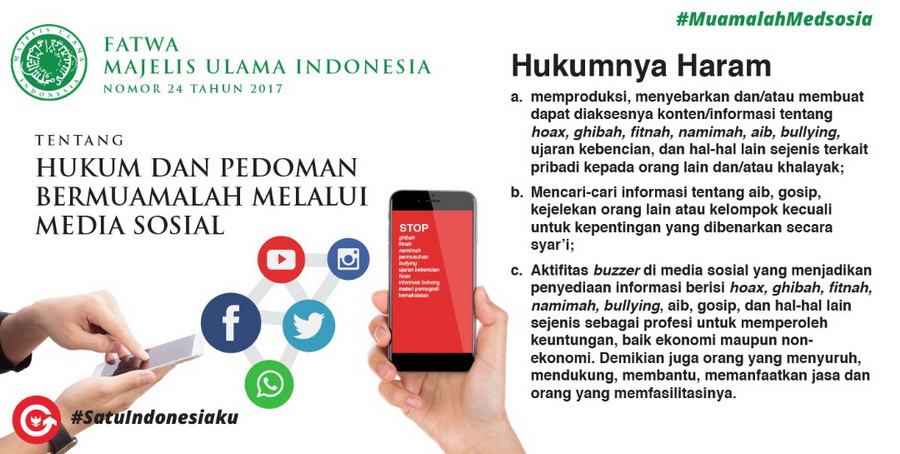 MAJELIS ULAMA INDONESIA (MUI) keluarkan Fatwa MUI Nomor 24 tahun 2017 tertanggal 13 Mei 2017, tentang Hukum dan Pedoman Bermuamalah Melalui Media Sosial. Dalam fatwa tersebut, MUI menegaskan beberapa hal yang diharamkan bagi umat Islam dalam bermedsos.