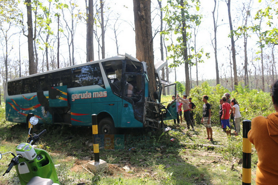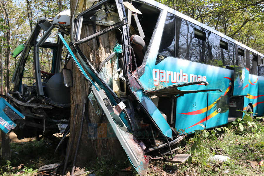 BLORA- Kecelakaan Bus Antar Kota Antar Propinsi (AKAP) terjadi di jalan nasional Blora-Cepu pada Minggu pagi (18/06/2017). Bus Garuda Mas dengan nopol B 7050 WV, tujuan Cepu yang berasal dari Jakarta yang di kemudi Ahmad Rusidi (47) warga Desa Harjowinangun Kecamatan Godong Kabupaten Grobogan diketahui remuk setelah menabrak sebuah pohon jati tua berdiameter sekitar 100 centimeter di tepi Jalan Blora-Cepu kilometer 26, turut wilayah Desa Sambongrejo Kecamatan Sambong Kabupaten Blora.