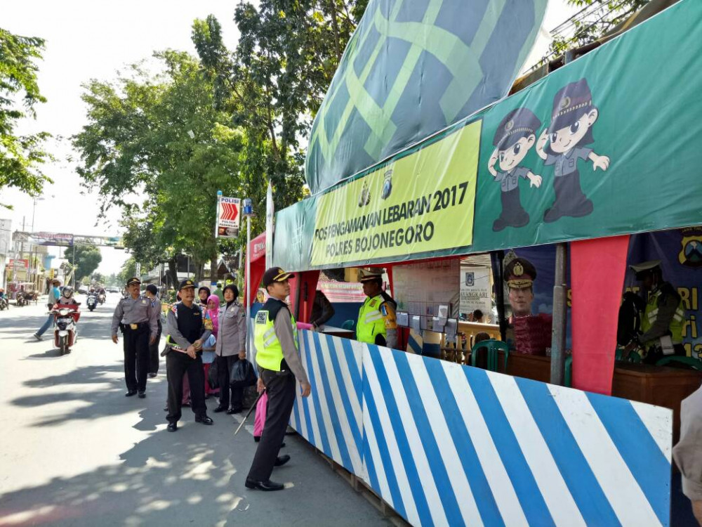 Bojonegoro Kota - Kapolres Bojonegoro AKBP Wahyu S Bintoro SH SIK MSi bersama Wakapolres Bojonegoro Kompol Dodon Priyambodo SH SIK MSi, para Pejabat Utama (PJU) serta Pengurus Bhayangkari Cabang Bojonegoro, pada Selasa (27/06/2017) sekira pukul 10.00 WIB kemarin pagi, sambangi para anggota yang sedang berjaga dan memberikan pelayanan dan pengamanan kepada para pemudik serta warga masyarakat yang sedang merayakan Lebaran 1438 H di Pos Pengamanan dan Pos Pelayanan Peduli Operasi Ramadniya.