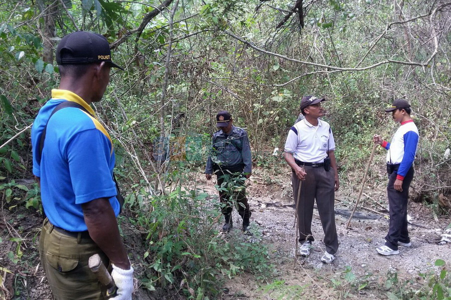 Ngambon - Jajaran Kepolisian Sektor (Polsek) Ngambon bersama anggota Perhutani, pada Jumat (07/07/2017) mulai pukul 08.30 WIB hingga pukul 11.30 WIB kemarin, lakukan penyisiran dan pencarian barang bukti, kunci kontak mobil Honda Mobilio dan sandal milik korban, Ali Mukhit (53), warga Jalan Wadung Asri Dalam Nomor 66 Kelurahan Wadung Asri RT 003 RW 003 Kecamatan Waru Kabupaten Sidoarjo, yang ditemukan dalam kondisi meninggal dunia pada Minggu (02/07/2017) sekira pukul 16.00 WIB lalu. Pencarian tersebut sebagai upaya untuk mengungkap misteri penyebab kematian korban.