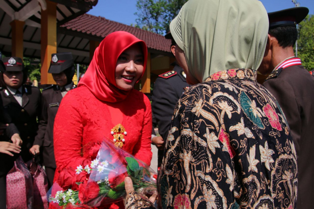 Dalam kesempatan upacara tersebut, Kapolres juga memberikan ucapan selamat dengan mengalungkan medali sebagai wujud telah selesainya pengabdian kepada bangsa melalui institusi Kepolisian Republik Indonesia dan pemberian bunga tangan, kepada para istri dari Ketua Bhayangkari Cabang Bojonegoro Ny Sistri Wahyu Bintoro. (her/imm)