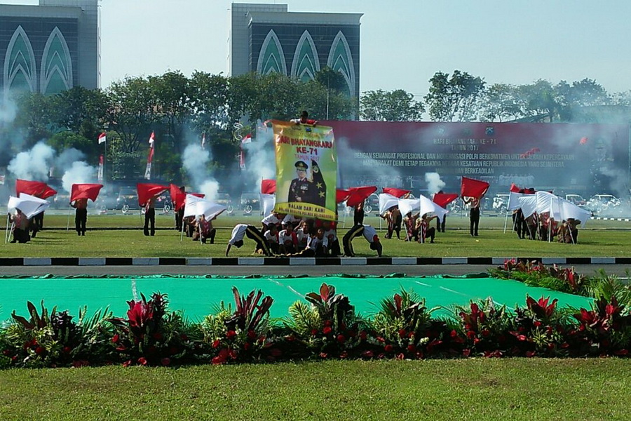 Rangkaian parade kolosal ditutup dengan formasi bendera merah putih membentuk huruf BHAYANGKARA oleh Pasukan Semaphore dan formasi barisan dengan membentuk angka 71 oleh pasukan Police Scout serta 2 Piramid oleh Pasukan Airfighter dengan membentangkan 2 buah Spanduk bertuliskan Selamat Hari Ulang Tahun Bhayangkara ke-71 Tahun 2017 Polda Jatim dan dimeriahkan dengan pesta kembang api.