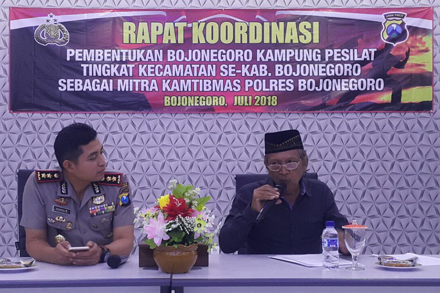 Bojonegoro Kota - Bertempat di Aula Parama Satwika, Kapolres Bojonegoro AKBP Wahyu S Bintoro SH SIK MSi, memimpin rapat rapat koordinasi (Rakor) pembentukan Bojonegoro Kampung Pesilat (BKP) tingkat kecamatan se-Kabupaten Bojonegoro pada Rabu (27/07/2017) siang kemarin. Dengan mengundang seluruh pengurus Perguruan Silat yang tergabung dalam kepengurusan BKP, Kapolres mengajak seluruh anggota perguruan silat untuk mensukseskan progam Kapolres ini.