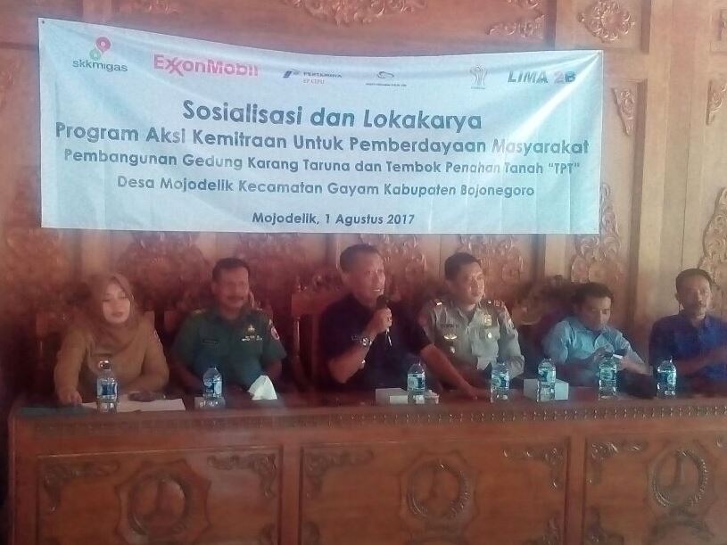 Gayam - Bertempat di balai Desa Mojodelik Kecamatan Gayam Kabupaten Bojonegoro, pada Selasa (001/08/2017) siang tadi, digelar Sosialisasi dan Lokakarya Program Aksi Kemitraan Untuk Pemberdayaan Masyarakat (Patradaya), untuk pembangunan gedung karang taruna dan tembok penahan tanah (TPT), Desa Mojodelik Kecamatan Gayam. Program Aksi Kemitraan Untuk Pemberdayaan Masyarakat ini didukung oleh Didukung oleh EMCL (ExxonMobil Cepu Limited) dan difasilitasi oleh LSM FOSPORA dan LIMA2B.