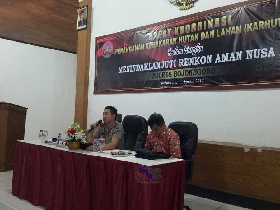 Bojonegoro Kota - Bertempat di Aula Meliwis Putih Mako Sat Lantas Polres Bojonegoro, pada Kamis (03/08/2017) mulai pukul 10.00 WIB kemarin, Kapolres Bojonegoro AKBP Wahyu S Bintoro SH SIK MSi mempimpin Rapat Koordinasi (Rakor) Penanganan Kebakaran Hutan dan Lahan (Karhutla), dalam rangka menindaklanjuti Rencana Kontigensi (Rekon) Aman Nusa II.