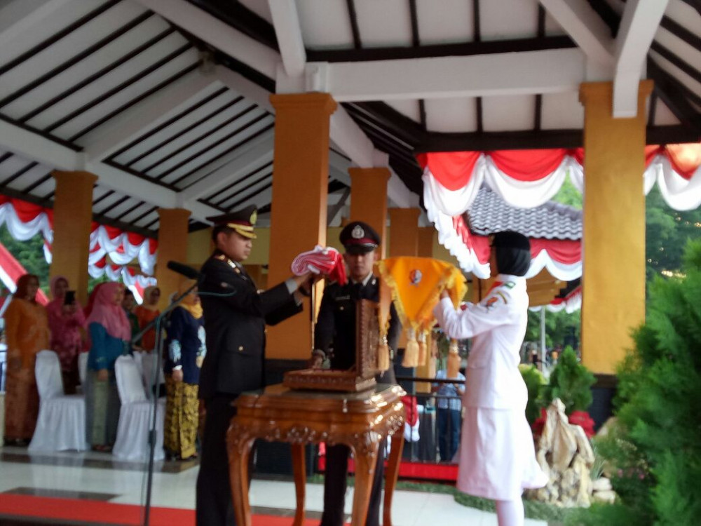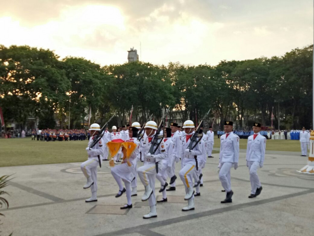 Pasukan pengibar bendera pusaka (Paskibraka) yang dipimpin Ipda Slamet Hariyanto berhasil menurunkan bendera merah putih dengan lancar pada pukul 16.00 WIB. (inc/imm)
