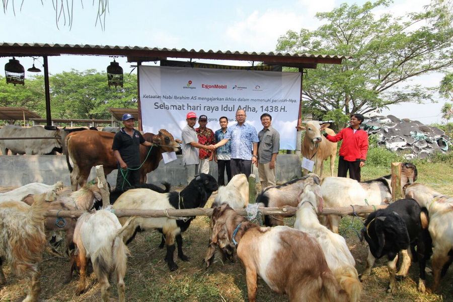 Gayam - Karyawan ExxonMobil Cepu Limited (EMCL) yang tergabung dalam Badan Dakwah Islam menyalurkan 40 ekor hewan kurban kepada masyarakat sekitar Kecamatan Gayam Kabupaten Bojonegoro, Kamis (31/08/2017). Hewan kurban yang terdiri dari beberapa ekor sapi dan kambing itu secara simbolik diserahkan perwakilan karyawan kepada desa-desa penerima dengan disaksikan ulama setempat.