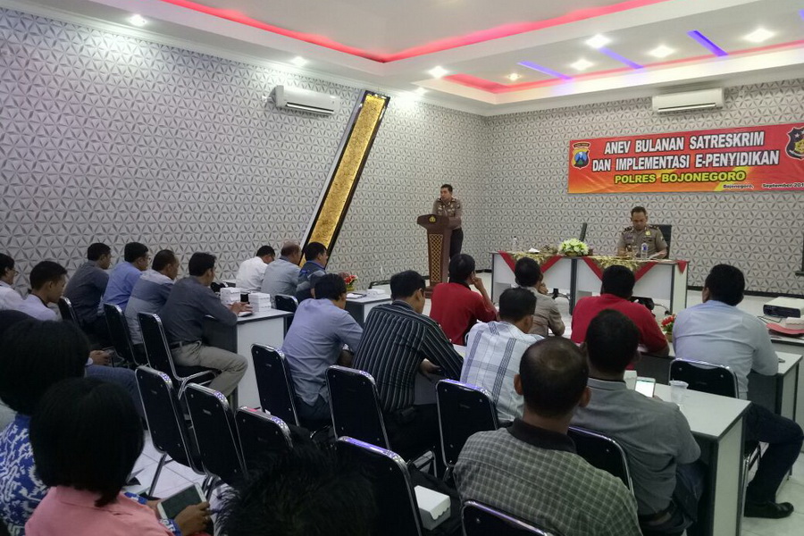 Dalam rangka meningkatkan kemampuan dan profesionalisme para penyidik, bertempat di Aula Parama Satwika, jajaran Polres Bojonegoro pada Kamis (14/09/2017) kemarin menggelar sosialiasi dan pelatihan aplikasi E-Penyidikan kepada seluruh anggota Sat Reskrim Polres Bojonegoro dan Kanit Reskrim Polsek jajaran yang dibuka langsung oleh Kapolres Bojonegoro AKBP Wahyu S Bintoro SH SIK MSi didampingi Wakapolres Bojonegoro, Kabag Ops, PS Kasat Reskrim Polres Bojonegoro.