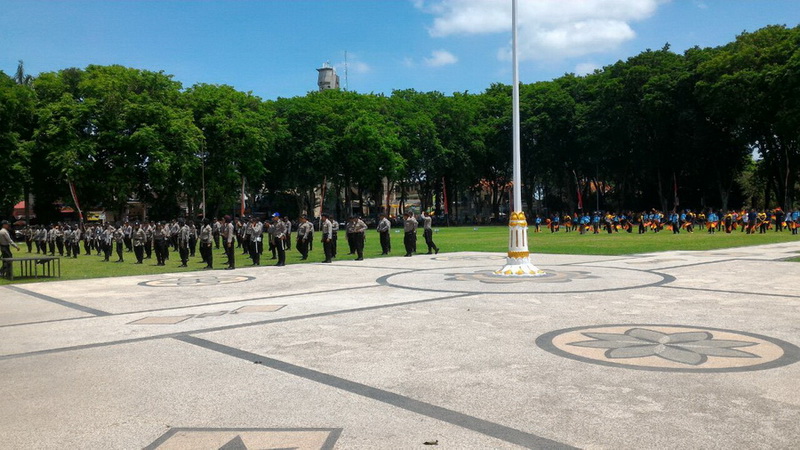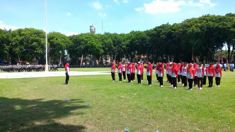 Bojonegoro Kota - Ribuan peserta dari anggota pramuka dari Police Scout Polres Bojonegoro dan prmuka dari Ponpes Al-Rosyid Dander, pesilat dari 13 perguruan yang tergabung dalam Bojonegoro Kampung Pesilat serta anggota kepolisian Polres Bojonegoro, pada Minggu (01/10/2017) pagi tadi, bertempat di Alun-alun Bojonegoro menggelar gladi bersih dalam rangka Kolosal Kolaborasi Pramuka dan Pesilat, yang menurut rencana akan digelar pada Selasa (03/10/2017) lusa.