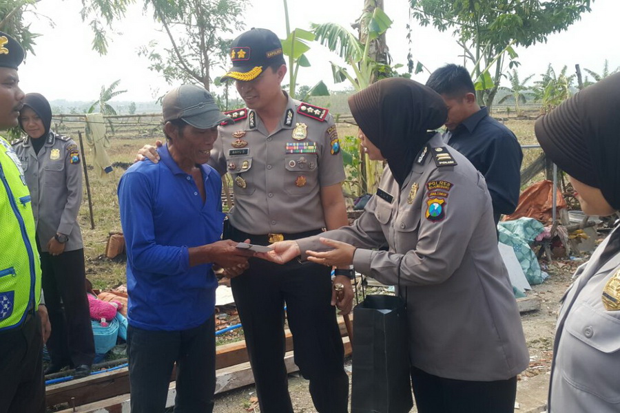 Kedatangan Kapolres beserta rombongan dilokasi disambut bahagia oleh Suparman (57) dan keluarga, sambil mendengarkan cerita tentang musibah yang menimpa Suparman dan sekeluarga, Kapolres memberikan santunan dan semangat kepada Suparman.