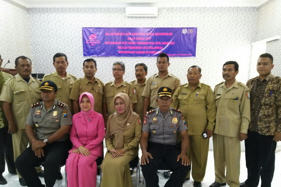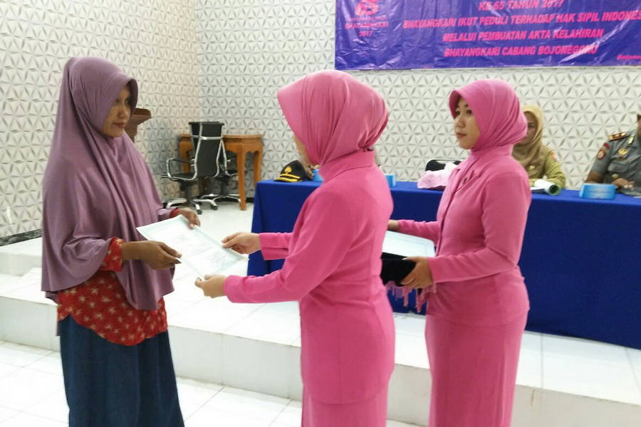 Bojonegoro Kota - Dalam rangka memperingati Hari Kesatuan Gerak Bayangkari (HKGB) yang ke-65 tahun 2017, Bhayangkari Cabang Bojonegoro bekerja sama dengan Dinas Kependudukan dan Catatan Sipil (Dispendukcapil) Kabupaten Bojonegoro, bertempat di Aula Parama Satwika Polres Bojonegoro, pada Senin (09/10/2017) pukul 10.00 WIB, selenggarakan acara pembagian Akta Kelahiran gratis