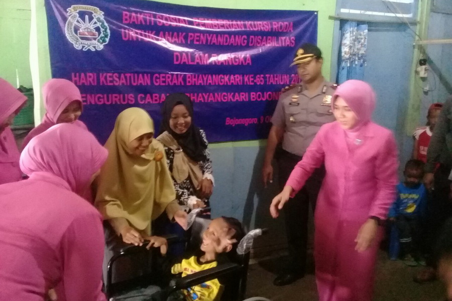 Bojonegoro - Dalam rangka memperingati Hari Kesatuan Gerak Bhayangkari (HKGB) ke 65, Bhayangkari Cabang Bojonegoro mengadakan bakti sosial dengan memberikan bantuan kursi roda kepada warga yang menderita penyakit, pada Senin (09/10/2017) siang.