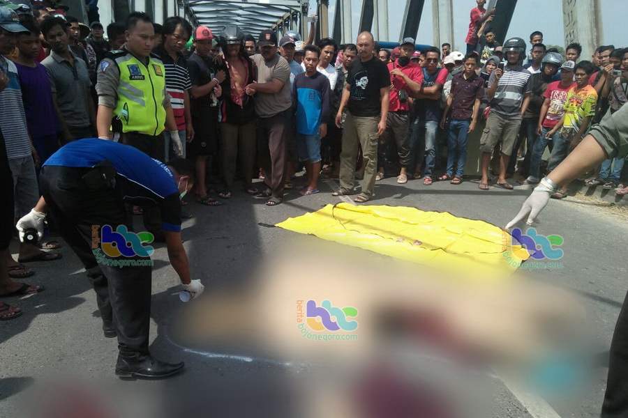 Bojonegoro Kota - Seorang perempuan pengendara motor, meninggal dunia di lokasi kejadian, setelah terlibat kecelakaan tabrak lari, di jalan raya jurusan Bojonegoro - Tuban, tepatnya di Jembatan Glendeng, turut wilayah Desa Kalirejo Kecamatan Bojonegoro Kota, pada Minggu (15/10/2017) sekira pukul 12.45 WIB singa tadi. Pengendara motor tersebut tersenggol truk yang hendak mendahuluinya yang berjalan searah di belakangnya, sehingga korban terjatuh di bawah kolong truk lalu terlindas ban truk. Akibatnya, pengendara motor tersebut meninggal dunia di lokasi kejadian sedangkan pemboncengnya mengalami luka berat.