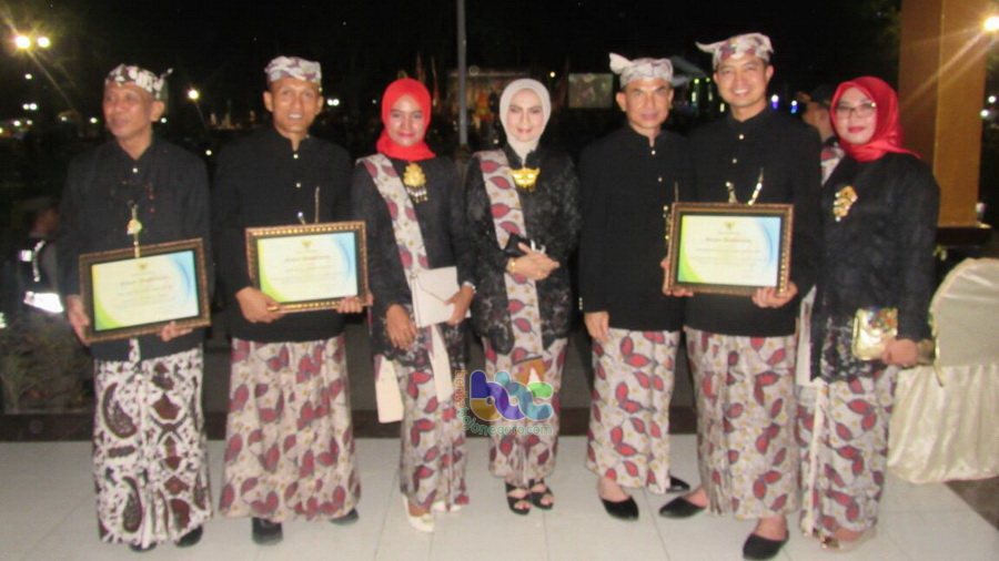 Bojonegoro Kota - Dalam acara Grebeg Berkah Jonegaran yang merupakan puncak acara peringatan Hari Jadi Bojonegoro (HJB) ke 340, pada Kamis (19/10/2017) malam, di Alun-alun Kota Bojonegoro, Kapolres Bojonegoro, AKBP Wahyu S Bintoro SH SIK MSi, didampingi ibu Ketua Bhayangkari cabang Bojonegoro, terima penghargaan dari Bupati Bojonegoro.