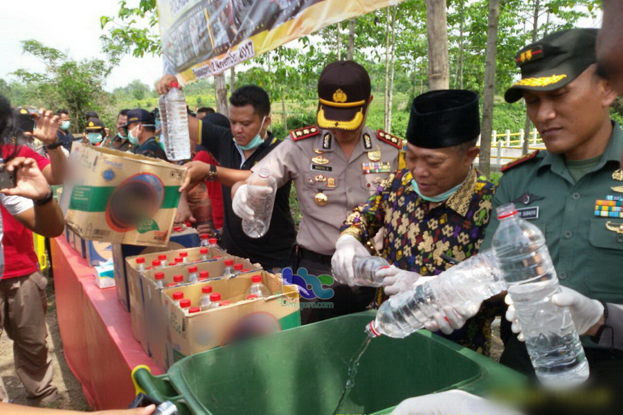 Bojonegoro - Kepolisian Resort Bojonegoro pada Kamis (02/011/2017) sekira pukul 09.00 WIB pagi, lakukan pemusnahan puluhan ribu liter minuman keras (miras) hasil Operasi Bina Kusuma tahun 2017, di TPA Desa Banjarsari Kecamatan Trucuk Kabupaten Bojonegoro.