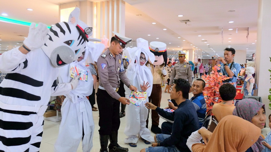 Kegiatan dilanjutkan Kasat Lantas beserta anggota dengan menuju ke lokasi KDS Swalayan. "Di sini sasaran kami adalah masyarakat pengunjung KDS Swalayan dengan membagikan brosur dengan masih mengajak pocong dan zebra kami," imbuh AKP Aris.