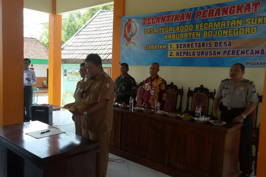 Pelantikan perangkat desa selanjutnya dilaksanakan di Desa Tegalkodo Kecamatan Sukosewu. Kepala Desa Tegalkodo, Sulistiyo, bertempat di balai desa setempat, laksanakan pelantikan perangkat desa yang baru.