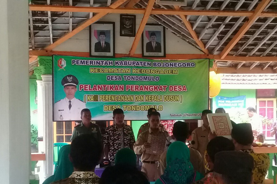 Informasi yang didapat awak media ini dari Asisten Pemerintahan dan Kesejahteraan Rakyat Pemkab Bojonegoro, Djoko Lukito SSos MM, pada Kamis (16/11/2017) hari ini, terdapat 9 desa di 6 kecamatan, yang melaksanakan pelantikan perangkat desa baru, yaitu Desa Geger dan Desa Toncomulo Kecamatan Kedungadem, Desa Sumberoto dan Desa Sumbergede Kecamatan Kepohbaru, Desa Gamongan dan Desa Napis Kecamatan Tambakrejo, Desa Bulu Kecamatan Sugihwaras, Desa Caruban Kecamatan Kanor.