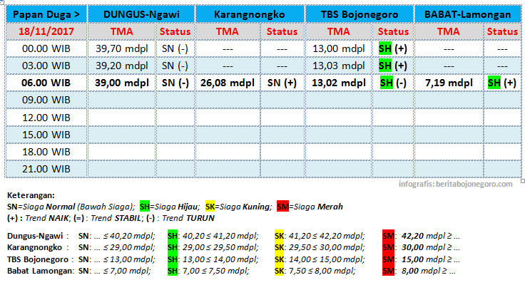 Berikut ini update status TMA Bengawan Solo, yang diterima dari UPT Pengelola Sumber Daya Air (UPT PSDA) Wilayah Sungai Bengawan Solo untuk tanggal 18 November 2017, hingga pukul 06.00 WIB. (*/imm)