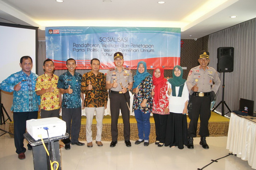 Bojonegoro Kota - Kapolres Bojonegoro AKBP Wahyu S Bintoro SH SIK MSi, saat hadiri Penyerahan Berita Acara Hasil Penelitian Administrasi Pendaftaran Verifikasi dan Penetapan Partai Politik Peserta Pemilihan Umum Tahun 2019, yang diselenggarakan oleh KPUD Bojonegoro di Hotel Dewarna Jalan Veteran Bojonegoro, Jumat (17-11-2017) pukul 09.00 WIB, ajak semua pihak yang terlibat dalam pemili, baiki penyelenggara maupun peserta, mempunyai integritas yang tinggi untuk menyukseskan Pemilukada Bupati Bojonegoro dengan damai, Jurdil dan bersih serta berwibawa.