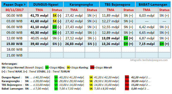 Berikut ini update status TMA Bengawan Solo, yang diterima dari UPT Pengelola Sumber Daya Air (UPT PSDA) Wilayah Sungai Bengawan Solo untuk tanggal 30 November 2017, hingga pukul 15.00 WIB. (*/imm)