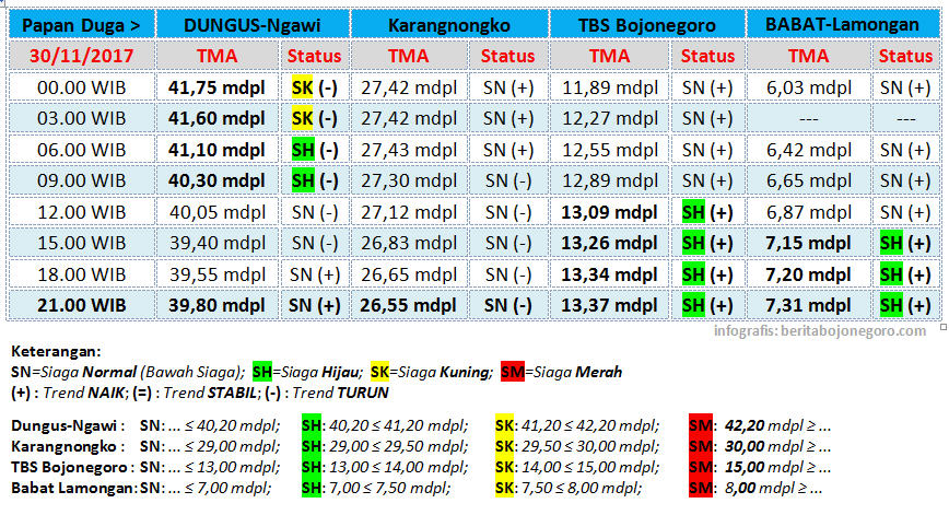 Berikut ini update status TMA Bengawan Solo, yang diterima dari UPT Pengelola Sumber Daya Air (UPT PSDA) Wilayah Sungai Bengawan Solo untuk tanggal 30 November 2017, hingga pukul 21.00 WIB. (*/imm)