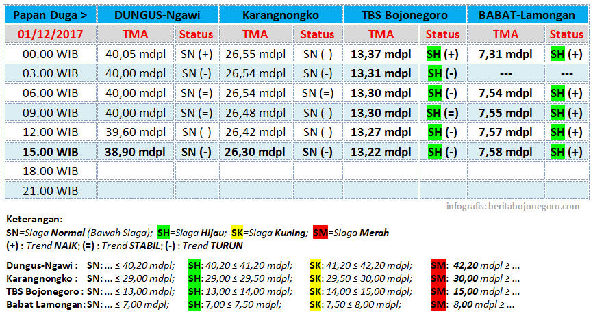 Berikut ini update status TMA Bengawan Solo, yang diterima dari UPT Pengelola Sumber Daya Air (UPT PSDA) Wilayah Sungai Bengawan Solo untuk tanggal 01 Desember 2017, hingga pukul 15.00 WIB. (*/imm)