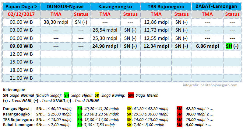 Pada Sabtu (02/12/2017), pukul 00.00 WIB, Bojonegoro Kota kembali dalam status siaga normal atau di bawah siaga dengan trend terus mengalami penurunan.