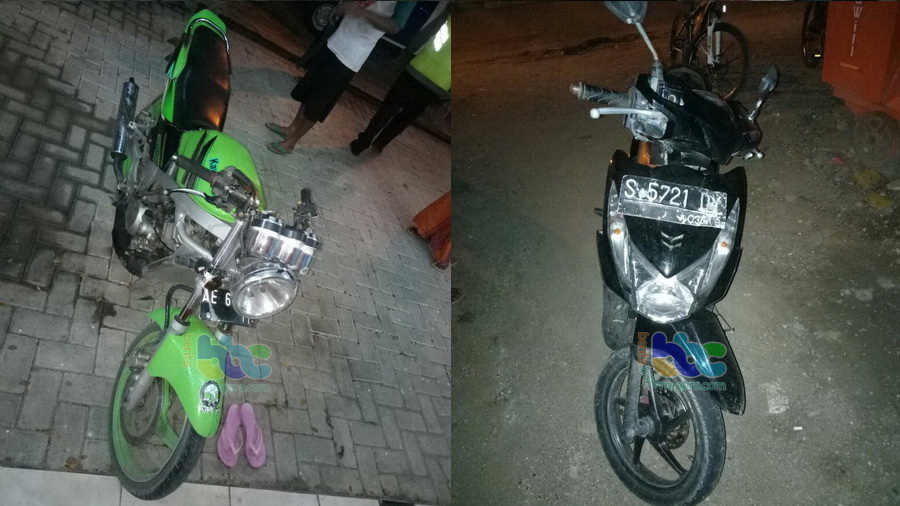 Bojonegoro (Padangan) - Kecelakaan antara dua sepeda motor terjadi di jalan raya Bojonegoro-Ngawi, tepatnya di jalan raya turut wilayah Desa Padangan Kecamatan Padangan Kabupaten Bojonegoro, pada Kamis (07/12/2017) sekira pukul 20.45 WIB tadi malam. Diduga sepeda motor Kawasaki Ninja sedang balapan, menabrak dari belakang sepeda motor Honda Beat yang berjalan searah didepannya. Akibatnya pembonceng Honda Beat mengalami luka terbuka di kaki kiri harus mendapat perawatan di rumah sakit.
