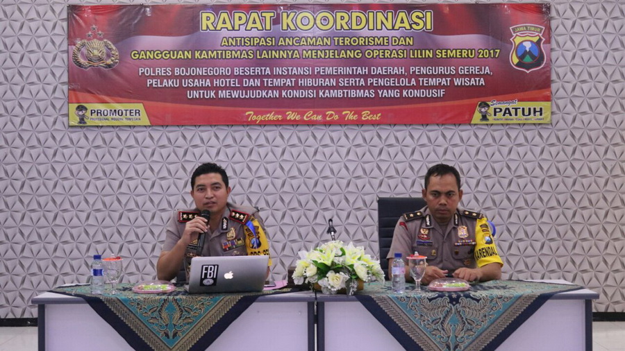 Rakor dipimpin oleh Kapolres Bojonegoro AKBP Wahyu S Bintoro SH SIK MASi, didampingi Kabag Ops Kompol Teguh Santoso SE dan dihadiri para Kabag, Kasat, Kapolsek, anggota Kodim, Para Pendeta, Pemilik Hotel, tempat wisata dan tempat hiburan di wilayah Bojonegoro.