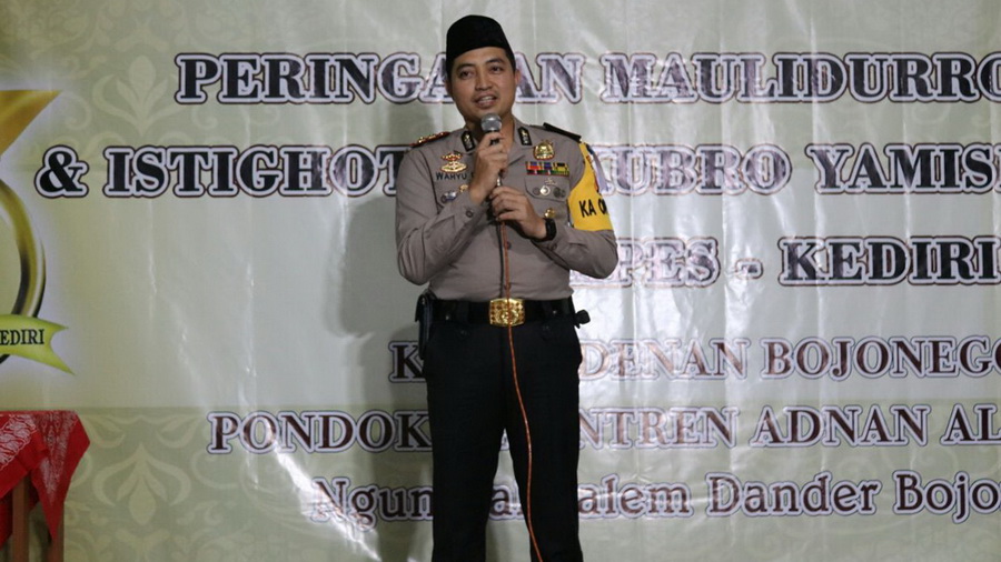 Bojonegoro - Masih banyaknya kasus kecelakaan yang terjadi di wilayah hukum Polres Bojonegoro jelang penghujung tahun 2017, bahkan hingga mengakibatkan korban meninggal dunia, Kapolres Bojonegoro AKBP Wahyu S Bintoro SH SIK MSi sampaiakn pesan-pesan keselamatan berlalu lintas dan pesan-pesan kamtibmas, pada jamaah Pengajian umum dan Istighotsah Kubro dalam rangka peringatan Maulid Nabi Muhammad SAW 1439 H yang diselenggarakan oleh pengasuh Pondok Pesantren (Ponpes) Adnan Al-Charish Desa Ngumpak Dalem pada Sabtu (23/12/2017) tadi malam.