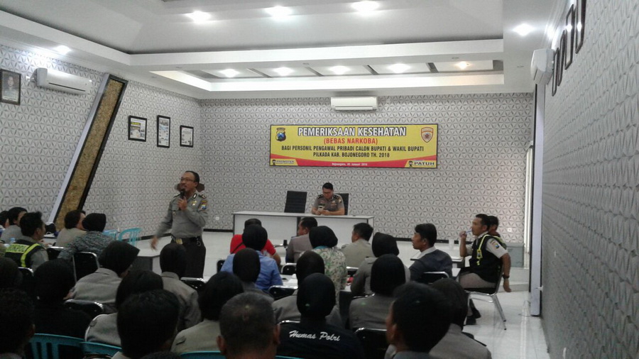 Bojonegoro Kota - Sebanyak 92 personel dari Polres dan Polsek jajaran yang dipersiapkan sebagai petugas pengawal pribadi Calon Bupati dan Calon Wakil Bupati yang akan mengikuti Pemilukada Kabupaten Bojonegoro, pada Jum'at (05/01/2018) kemarin ikuti tes kesehatan di Aula Parama Satwika Polres Bojonegoro.