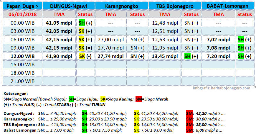 Berikut ini update status TMA Bengawan Solo, yang diterima dari UPT Pengelola Sumber Daya Air (UPT PSDA) Wilayah Sungai Bengawan Solo untuk tanggal 06 Januari 2018, hingga pukul 12.00 WIB. (*/imm)