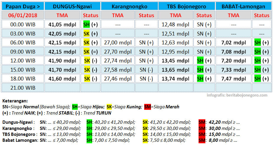 Berikut ini update status TMA Bengawan Solo, yang diterima dari UPT Pengelola Sumber Daya Air (UPT PSDA) Wilayah Sungai Bengawan Solo untuk tanggal 06 Januari 2018, hingga pukul 18.00 WIB. (*/imm)