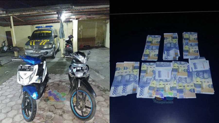 Saat ini penyidik dari Unit Reskrim Polsek Sumberrejo masih terus mengembangkan kasus tersebut dan telah memeriksa 2 (dua) orang saksi yaitu Mahfud Bin Suraji (41) warga Desa Tulungrejo Kecamatan Sumberrejo dan Slamet (30) warga Desa Karangdowo Kecamatan Sumberrejo serta mengamankan barang bukti berupa 2 (dua) unit sepeda motor jenis Honda Supra X dan Honda Bead serta uang kertas pecahan Rp 50 sejumlah Rp 7,4 juta.
