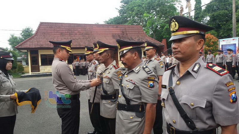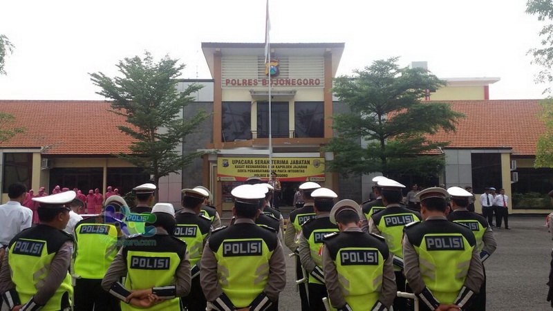 Bojonegoro Kota - Kapolres Bojonegoro, AKBP Wahyu S Bintoro SH SIK MSi, pada Senin (08/01/2018) pagi, bertempat di halaman Mapolres Bojonegoro, memimpin apel serah terima jabatan sejumlah perwira di jajaran Polres Bojonegoro. Mutasi tersebut sebagaimana tertuang dalam Surat Telegram Kapolda Jatim Nomor: ST/2740/XII/2017/RO SDM, tertanggal 30 Desember 2017, tentang Pemberhentian dari dan Pengangkatan dalam Jabatan Perwira atau Mutasi pada Jajaran Polda Jatim.