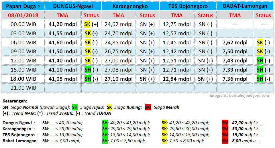 Kepala Pelaksana Badan Penanggulangan Bendana Daerah (BPBD) Kabupaten Bojonegoro, Andik Sujarwo, kepada awak media menyampaikan bahwa kondisi Tinggi Muka Air (TMA) Bengawan Solo papan duga TBS Bojonegoro Kota pada Senin (08/01/2018)pukul 18.00 WIB pada skala 12.84 mdpl. Meskipun pada level di bawah siaga, namun saat ini TMA Dungus Ngawi menunjukkan level siaga kuning, sehingga dipastikan berpengaruh pada kenaikan TMA di Kabupaten Bojonegoro.