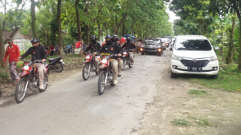 Bojonegoro - Kapolres Bojonegoro AKBP Wahyu S. Bintoro, SH., SIK., M.Si memimpin langsung jalannya pengamanan kunjungan kerja Menteri Pertanian RI Dr. Ir. H. Andi Amran Sulaiman, pada Senin (22/01/2018) di Desa Gedongarum dan Desa Temu Kecamatan Kanor Kabupaten Bojonegoro dengan menggunakan motor trail bersama Wakapolres dan tim Panther Polres Bojonegoro. Kunjungan Mentan ke Kecamatan Kanor tersebut dalam rangka melakukan tanam dan panen raya padi di dua desa tersebut.