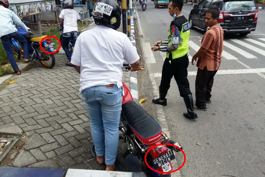 Bojonegoro Kota - Entah apa yang melatar-belakangi kedua pemilik kendaraan bermotor ini, sehingga dengan sengaja menggunakan tanda nomor kendaraan bermotor (TNKB) yang tidak sesuai dengan standar yang dipersyaratkan. Satu diantaranya menggunakan TNKB beruliskan “GENERASI MICIN” dan seorang lainnya menggunakan TNKB bertuliskan “KIDS ZAMAN NOW”.