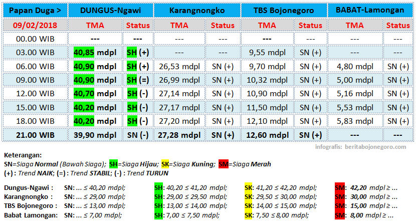 Berikut ini update status TMA Bengawan Solo, yang diterima dari UPT Pengelola Sumber Daya Air (UPT PSDA) Wilayah Sungai Bengawan Solo untuk tanggal 09 Pebruri 2018, hingga pukul 21.00 WIB. (*/imm)