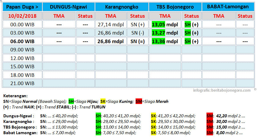 Pada Sabtu (10/02/2018) pukul 00.00 WIB dini hari tadi, elevasi Tinggi Muka Air (TMA) Bengawan Solo pada papan duga TBS Bojonegoro Kota telah masuk dalam status siaga hijau, dengan trend masih terus mengalami kenaikan.
