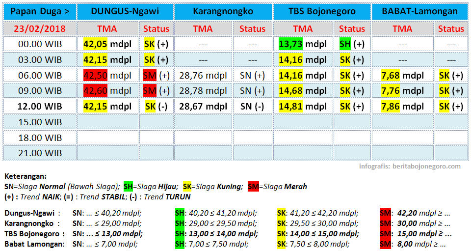 Berikut ini update status TMA Bengawan Solo, yang diterima dari UPT Pengelola Sumber Daya Air (UPT PSDA) Wilayah Sungai Bengawan Solo untuk tanggal 23 Pebruri 2018, hingga pukul 12.00 WIB. (*/imm)