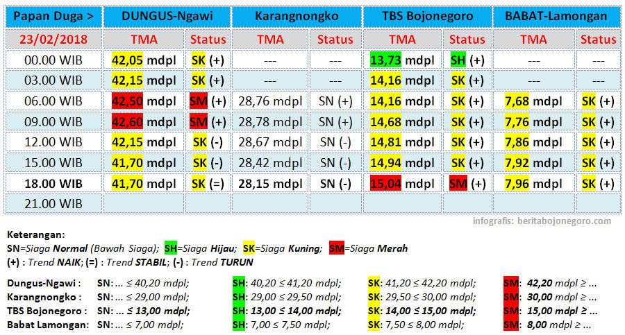 Berikut ini update status TMA Bengawan Solo, yang diterima dari UPT Pengelola Sumber Daya Air (UPT PSDA) Wilayah Sungai Bengawan Solo untuk tanggal 23 Pebruri 2018, hingga pukul 18.00 WIB. (*/imm)