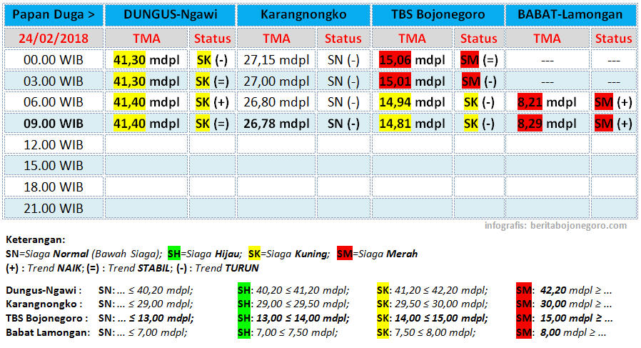 Berikut ini update status TMA Bengawan Solo, yang diterima dari UPT Pengelola Sumber Daya Air (UPT PSDA) Wilayah Sungai Bengawan Solo untuk tanggal 24 Pebruri 2018, hingga pukul 09.00 WIB. (*/imm)