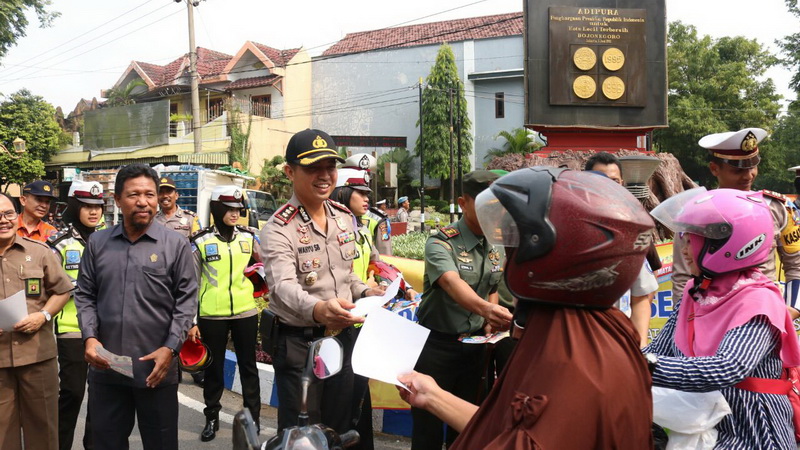 Bojonegoro - Guna mensosialisasikan pelaksanaan Operasi Keselamatan Semeru 2018 yang akan berlangsung tanggal 05- 25 Maret 2018, Polres Bojonegoro bersama Forpimda, bagikan helm gratis kepada pengguna jalan yang melintas di sekitar Bundaran Adipura, Kelurahan Sumbang Bojonegoro Kota, pada Kamis (01/03/2018) pagi, seusai pelaksanaan Apel Gelar Pasukan Operasi Keselamatan Semeru 2018.